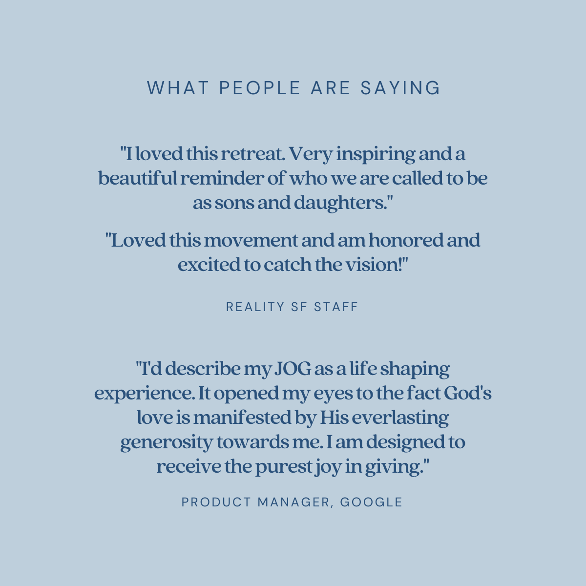 Our partners at Generous Giving provide transformational experiences called “Journey of Generosity” or JOGs to explore the joy of giving. These retreats provide inspiration and powerful insight within a confidential, small group environment of 10-14 peers. The sole purpose of a JOG is to explore biblical generosity in a safe, no-pressure environment.